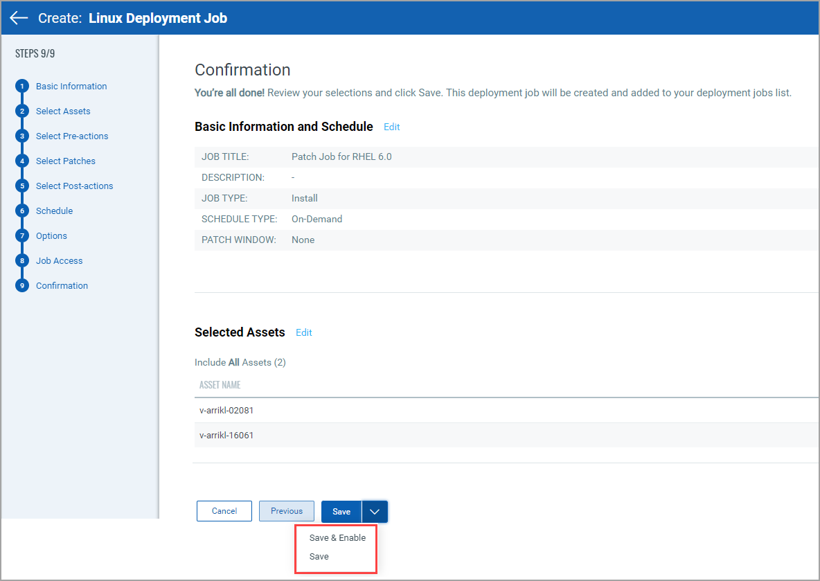 12. On the Confirmation page, review the settings and click Save to create the job or click Save and Enable to deploy the job immediately.