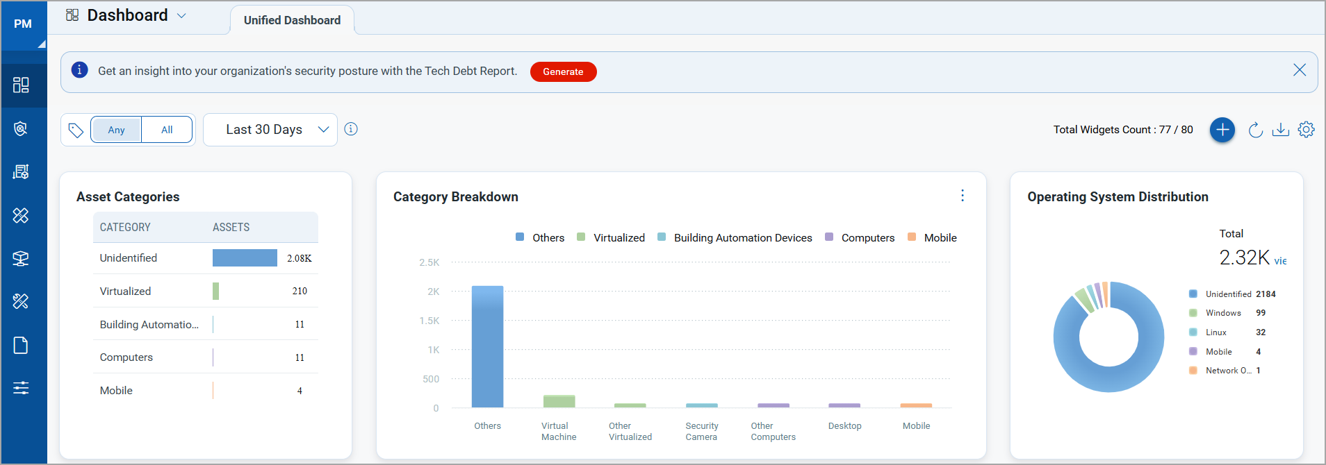Dashboards help you visualize your assets, see the open vulnerabilities, leverage saved searches, and patch Windows, Linux, and Mac vulnerabilities.