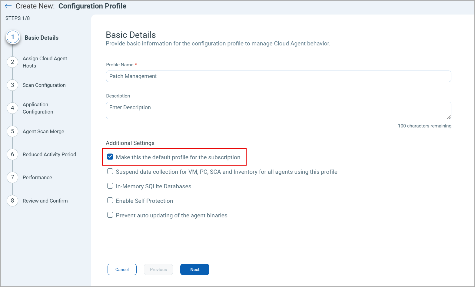 After you create a CA configuration profile, you must assign the CA configuration profile to your cloud agents. To know more details about the configuration profile settings, see the Qualys Cloud Agent online help.