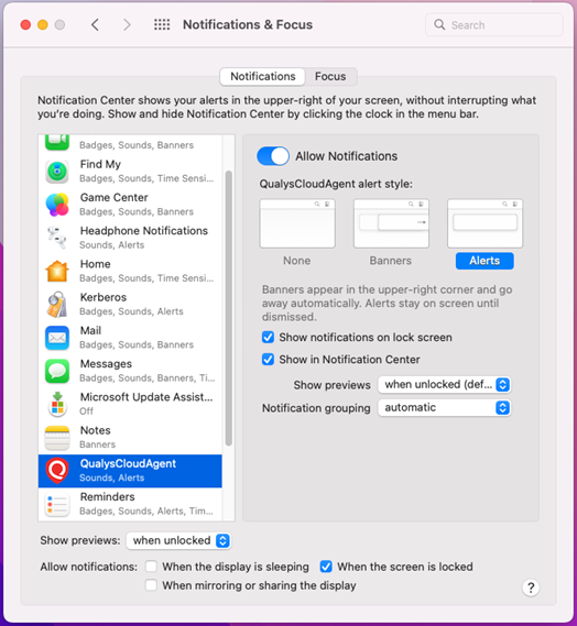 - To configure user notifications for Patch Management later, go to System Preferences > Notifications & Focus > Qualys Cloud Agent.