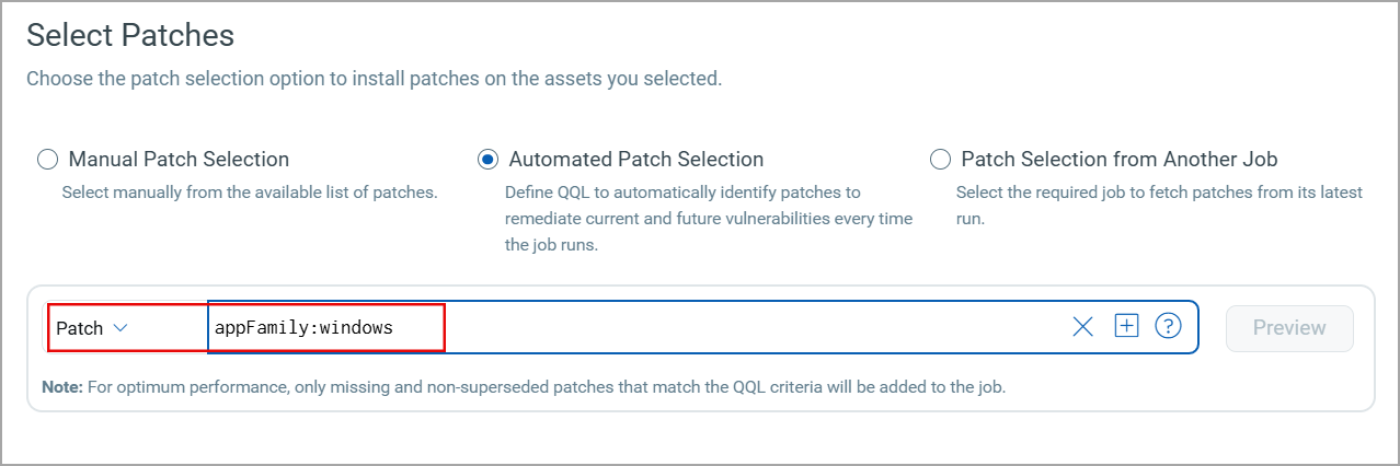 - Use of QQL, Patch List, and Patch Selector from another job is mutually exclusive and you can use only either one to create a job.