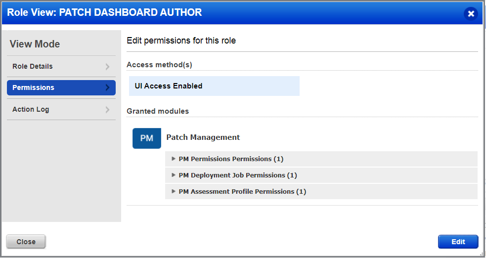 - Patch Dashboard Author: This is a special role that would be needed only for larger organizations that delegate development of dashboards to a dedicated team especially, one that does NOT operate/ manage the patching jobs. This role includes all the Patch Reader permissions.