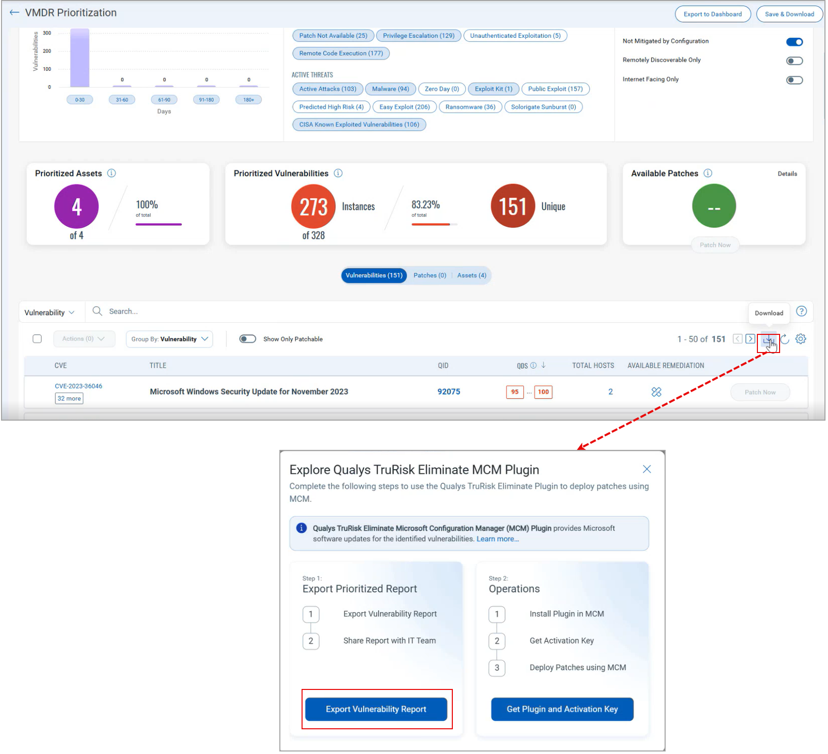 You can download the identified and prioritized vulnerability report from the VMDR application. The report is then imported into the Microsoft Endpoint Configuration Management (MECM) plugin, foremerly known as SCCM.