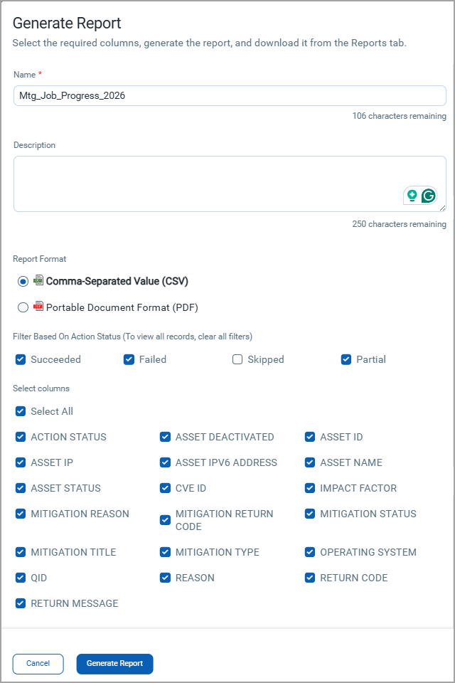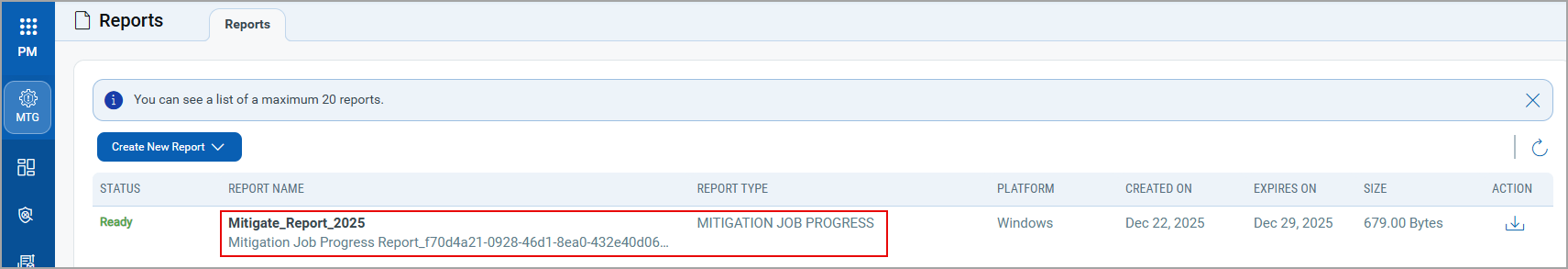 You can generate the job progress report for Windows, and Linux Mitigation jobs. The details about the mitigation actions are included in the report. You can also view the mitigation status and failure details.