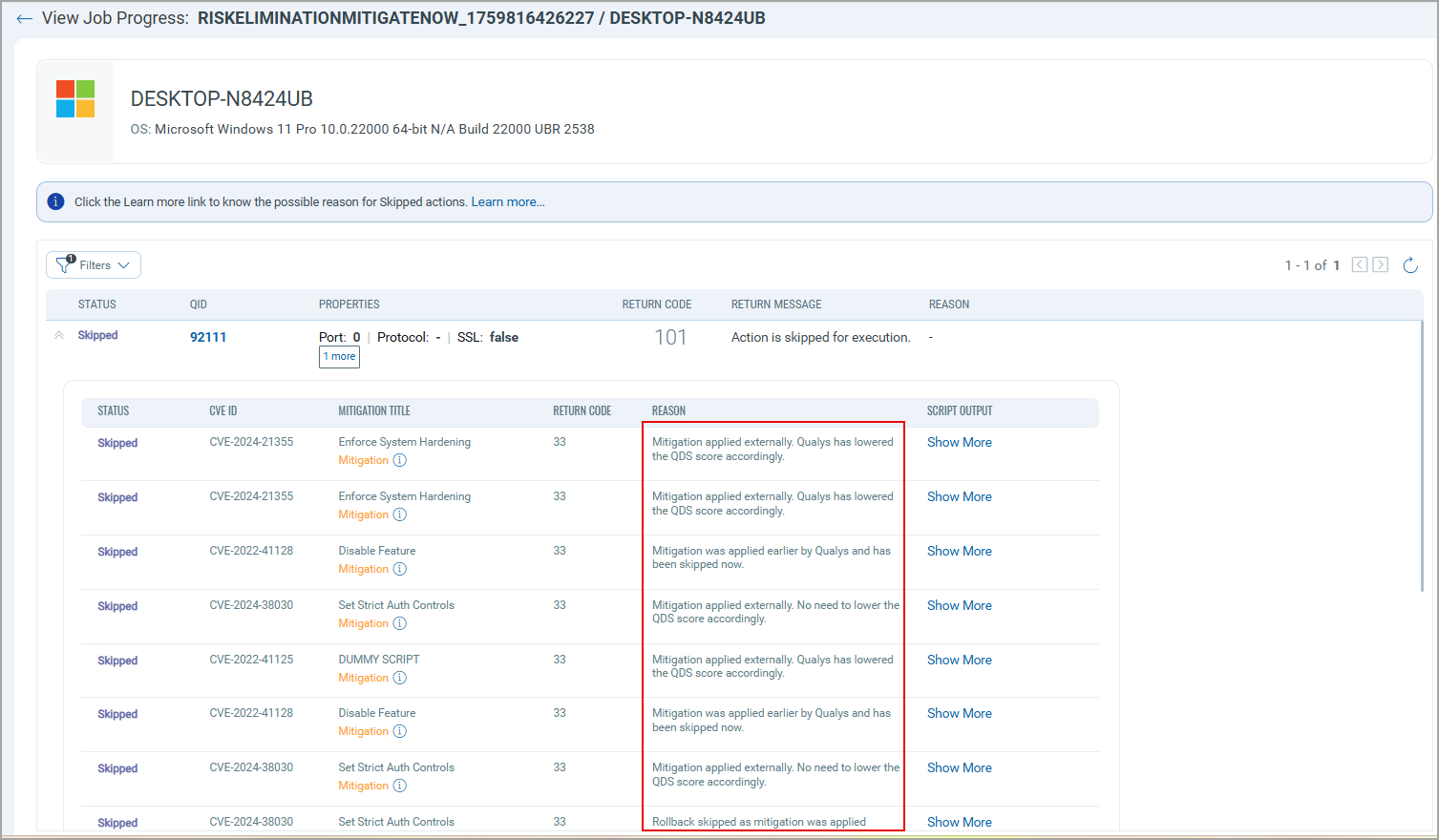 203: This status means that the mitigation is applied externally, and Qualys has just updated the QDS score. 204: This status means that Qualys has applied the mitigation earlier, hence mitigation was skipped now. 205: This status means that rollback action was skipped, as the mitigation was applied externally. 206: This status means that mitigation was skipped because it was applied externally, and Qualys has already updated the QDS score. The codes 203, 204, 205, and 206 appear only at the back-end and are not displayed on the Job Progress page. Only the reasons for each of them are displayed on the UI. To view the detailed script output, click Show More for the corresponding CVE under the Script Output column. |
