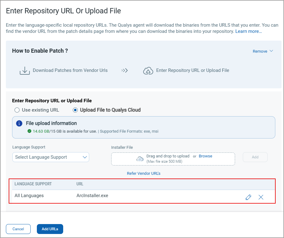 - Upload File to Qualys Cloud: You can upload your installer files to the Qualys Cloud storage. Each subscription is allocated 15 GB of storage on the Qualys Cloud, shared across all users within the subscription and can only upload a file up to 500MB at once. The supported file types for upload are .exe and .msi.