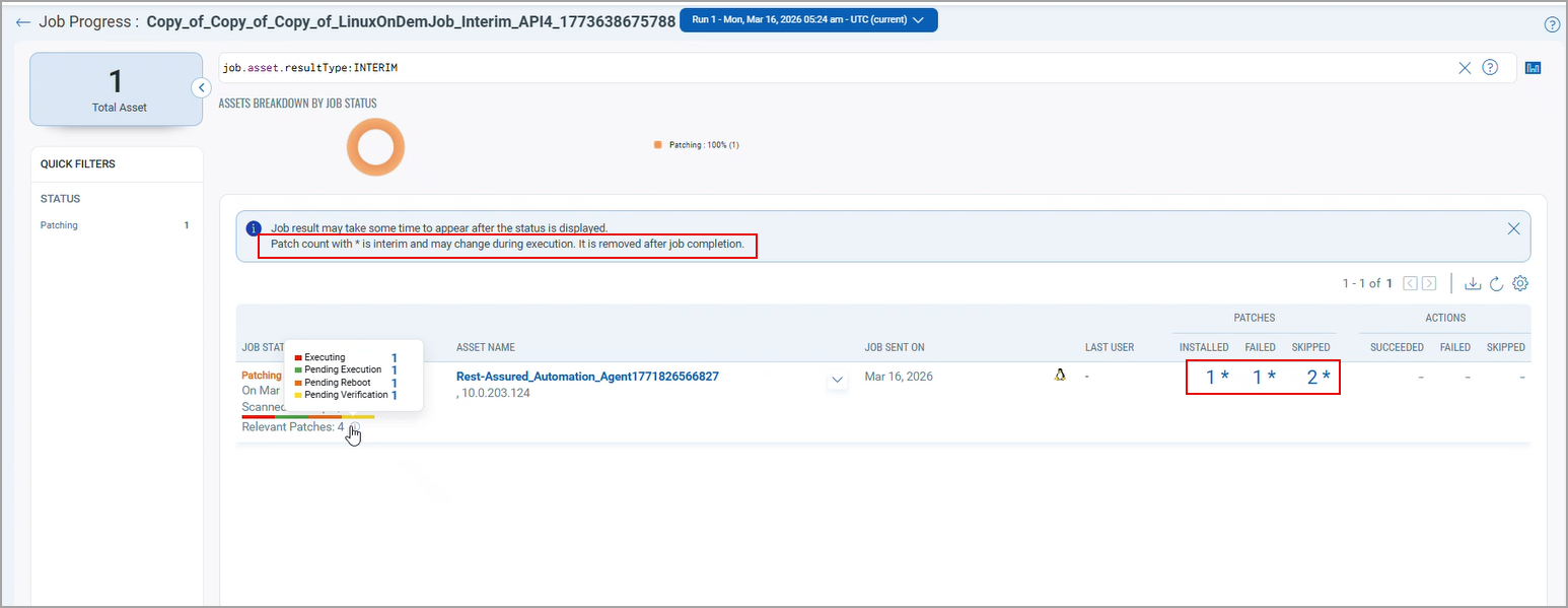 Under the Patches column, the number of Installed, Skipped and Failed patches are marked with an asterisk (*) to indicate that the count is interim and may change as the job progresses. Once the job execution is complete, the asterisk symbol is removed and final patch counts are displayed. The interim message Patch count with * is interim and may change during execution, it is removed after job completion is also removed from the Job Progress page. you can monitor patch job progress throughout the job life cycle. Even after execution completes, you can continue to view patch counts for assets awaiting reboot. After the reboot is completed, the job status finally updates to Completed or Completed with Failure.