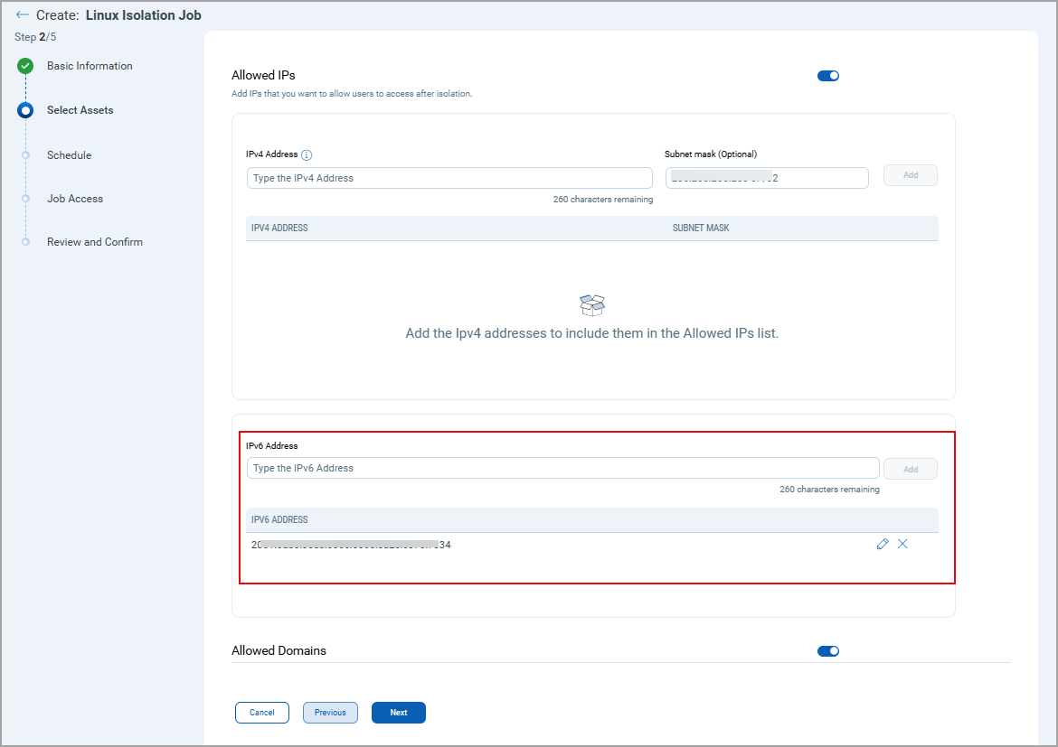You can now add IPv6 addresses to the Isolation Exceptions list when creating the Isolation job for Linux assets. This enhancement allows isolated Linux assets to communicate with IPv6 machines.