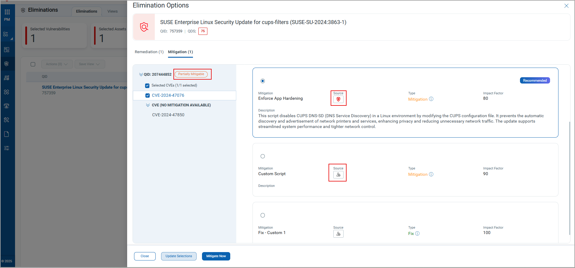QID status is now updated based on the selected CVEs and their available mitigations: