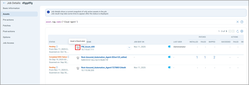 You can now see a deactivation indicator for an asset on the Job Progress page. If an asset was active during job execution but later becomes deactivated, an icon is displayed next to the asset name to highlight its deactivated status, as shown in the following figure.