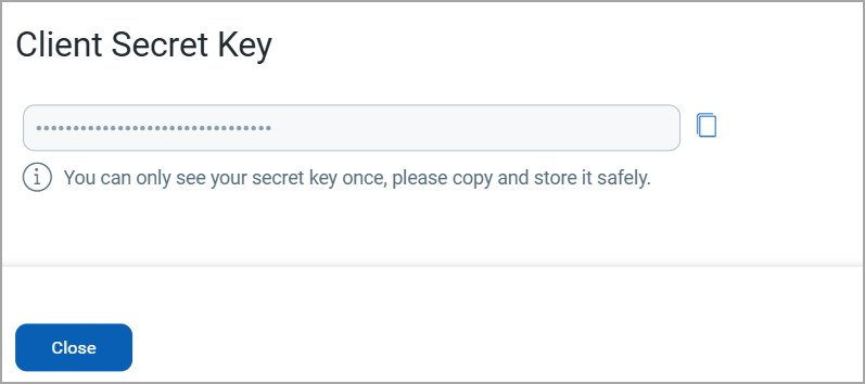 Once you click Create, a Client ID and Client Secret Key are automatically generated. The Client Secret Key is displayed only once. Make sure to copy and store it securely. This key is essential for generating JWT access tokens and cannot be retrieved later.