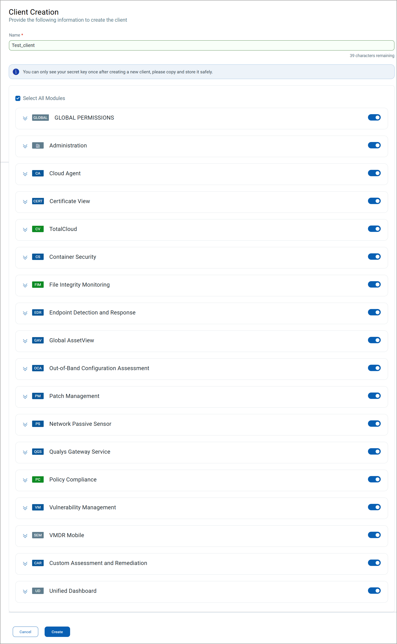 While creating a client, you can select all modules at once or individual modules as required. You can also set various permissions, including global permissions, dashboard permissions, tagging permissions, as well as API access. Depending upon these permissions, a user can access the modules and their features that are assigned to the client.