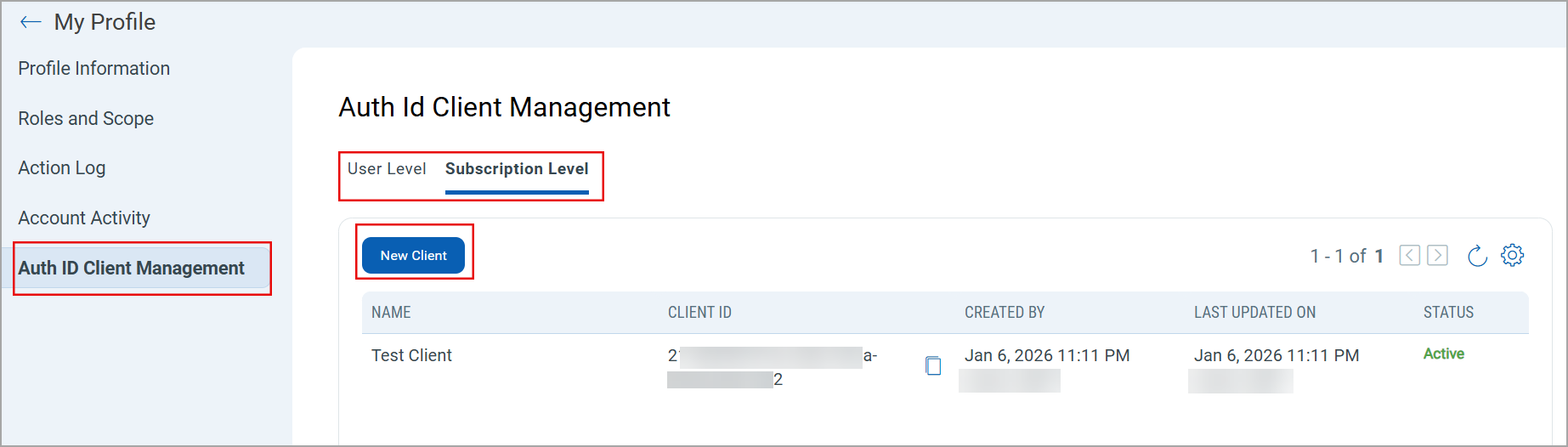 To access the client management tab, navigate to your profile icon, located at the top-right corner, and click View Profile > Auth Id Client Management tab.