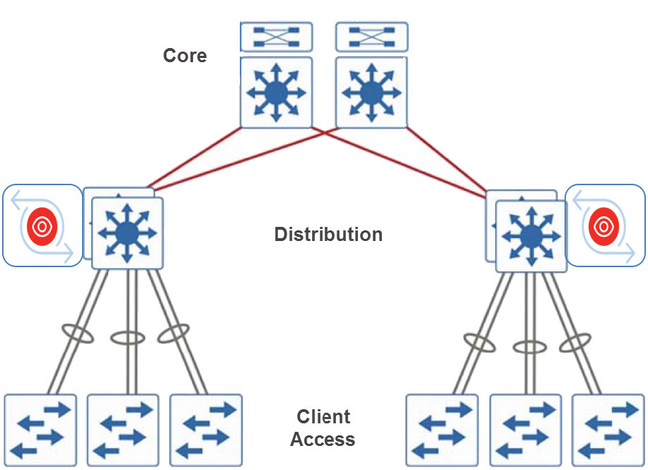 The following diagram shows passive sensors at the distribution layer. In this example, traffic from all devices in the Client Access network is aggregated at the distribution switches, and traffic from the distribution switches is aggregated at the core switch.