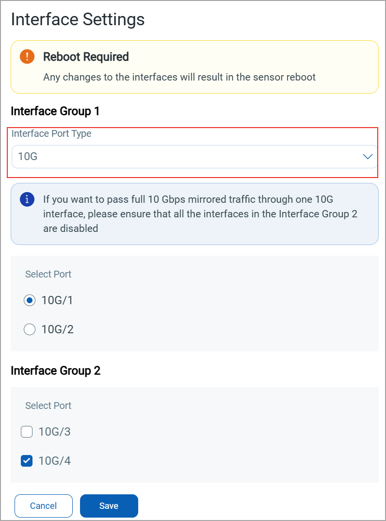 — The 1G interfaces (1G/1, 1G/2, 1G/3, 1G/4) and the 10G interfaces (10G/1, 10G/2) are part of Interface Group 1, while 10G/3 and 10G/4 are part of Interface Group 2. You can choose to use either the 1G ports or the 10G ports from Interface Group 1.