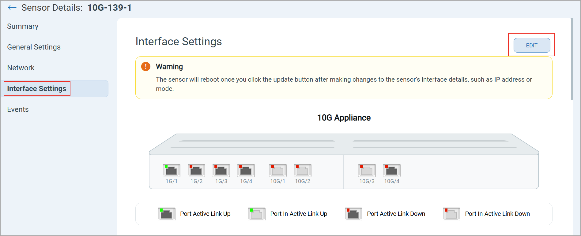 - Select a 10G appliance sensor to view the Sensor Details page.