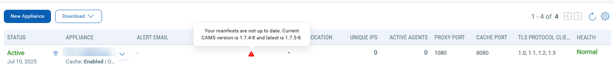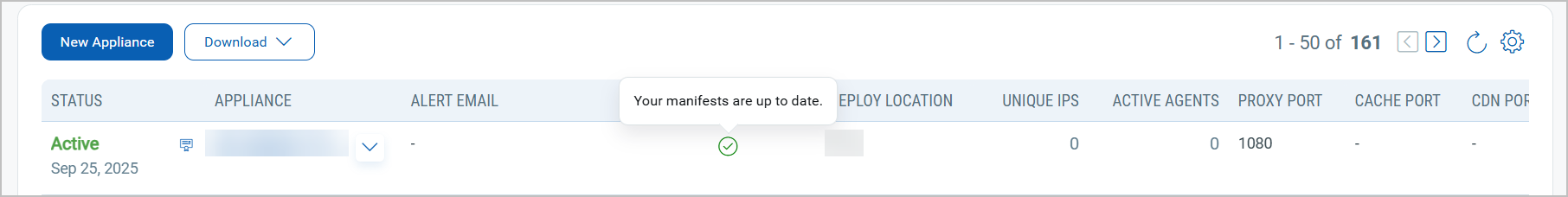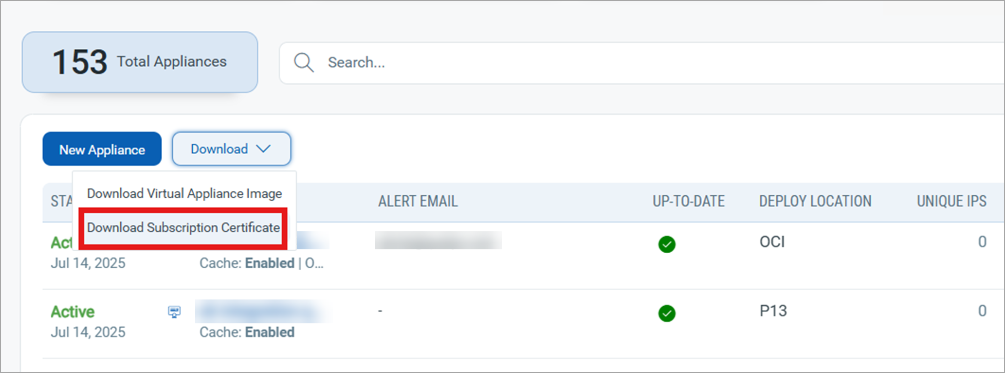 - Status: This column shows the current status of your appliance. Appliances with a common CA certificate enabled are shown as an icon (Highlighted) on the appliance list page.