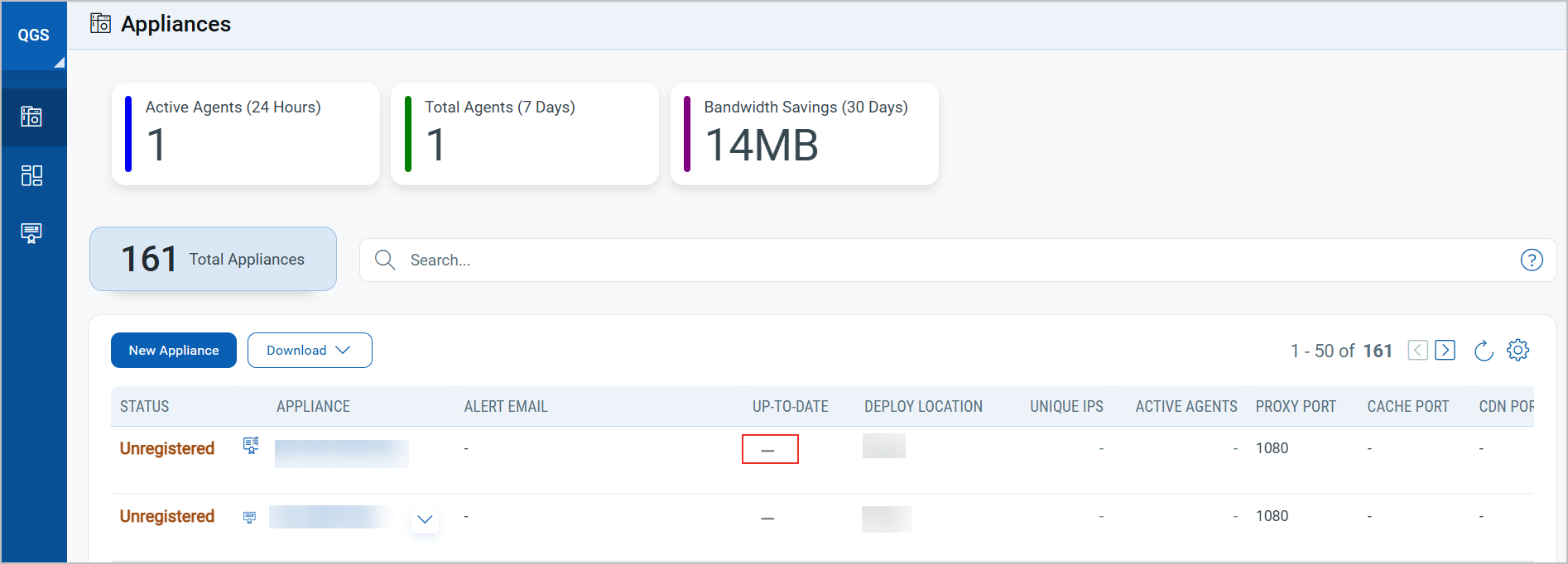 The QGS Appliance listing also displays appliance update status indicators, enhancing the visibility of appliance version compliance in the UP-TO-DATE column. These indicators help you quickly identify appliances that are not aligned with the latest deployed versions.