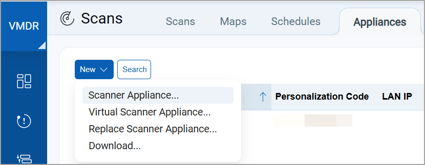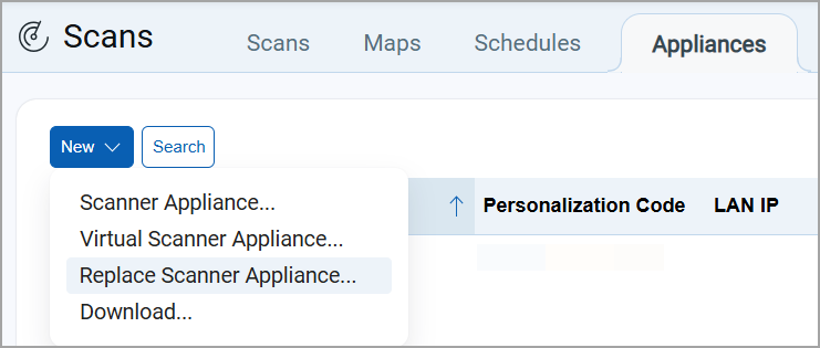 - Go to Scans > Appliances > New > Replace Scanner Appliance.