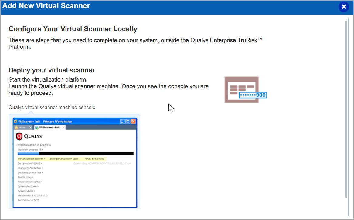 This is the first step for deploying Scanner. Add a new virtual scanner appliance to your account and obtain a personalization code.