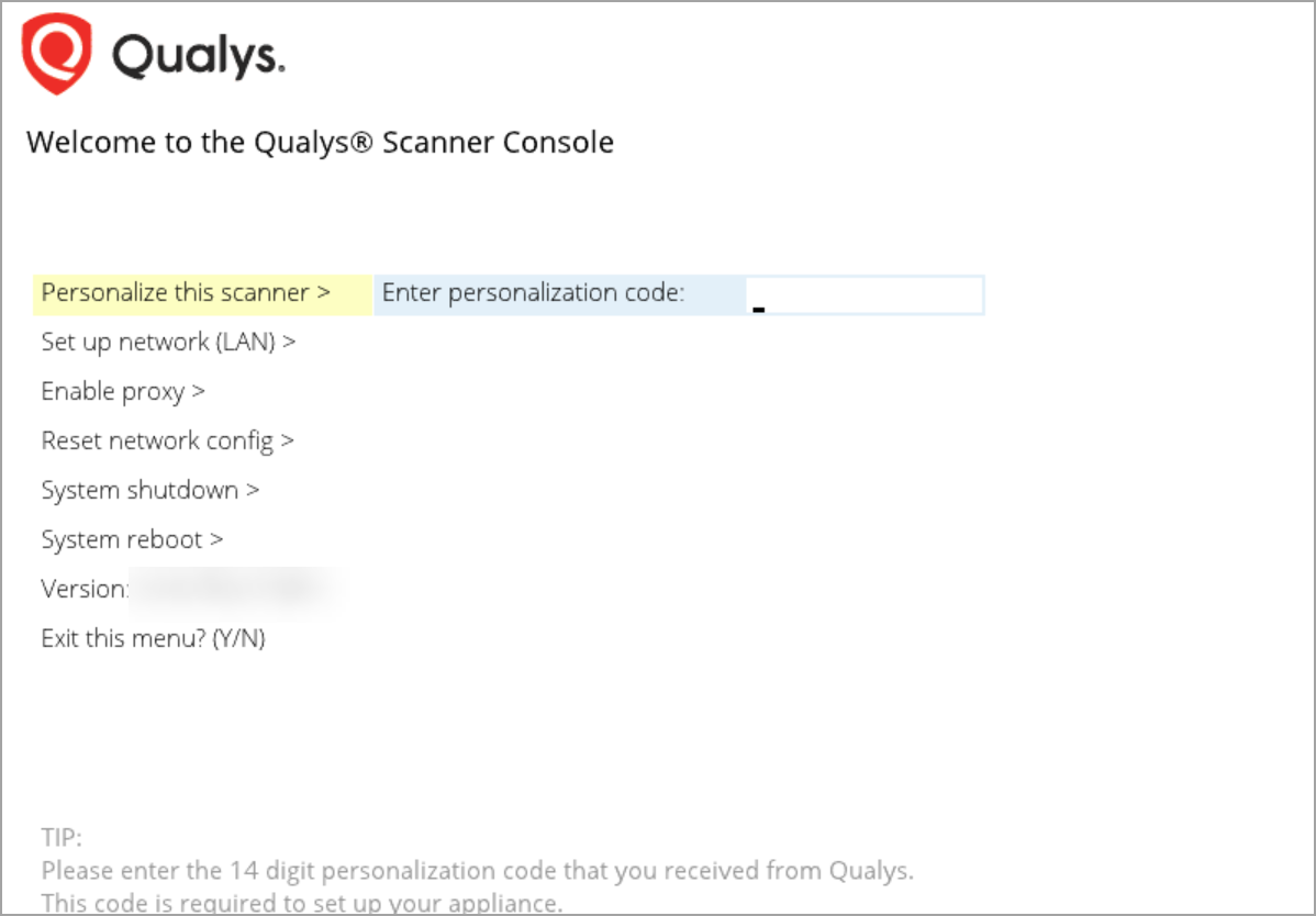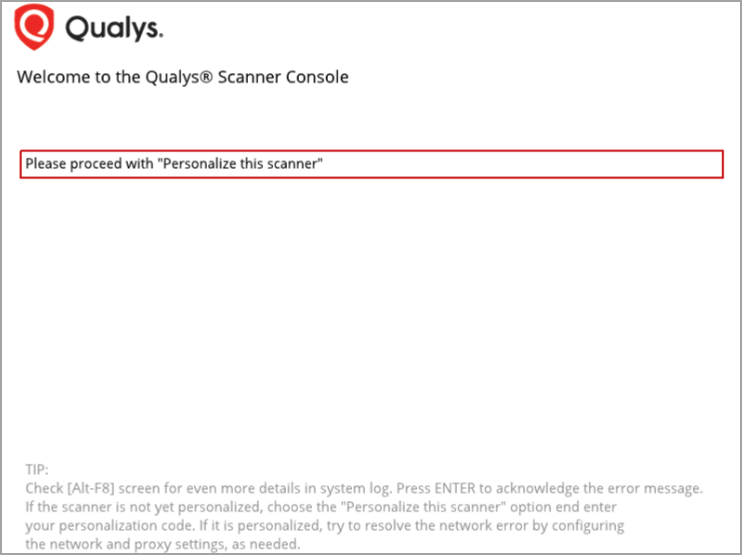 Once all the packages are downloaded, you see the message 'Welcome to the Qualys Scanner Console,' along with the appliance name and assigned IP address.