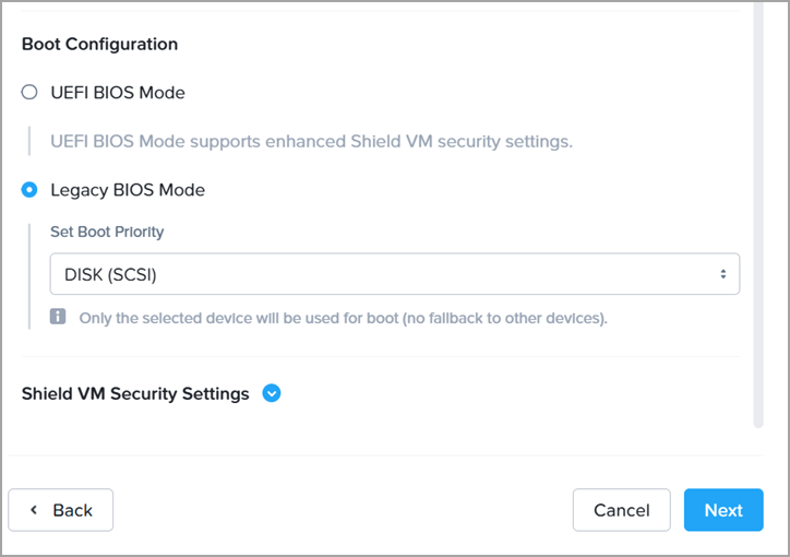 Choose Legacy BIOS Mode and select DISK(SCSI) for Set Boot Priority, then click Next