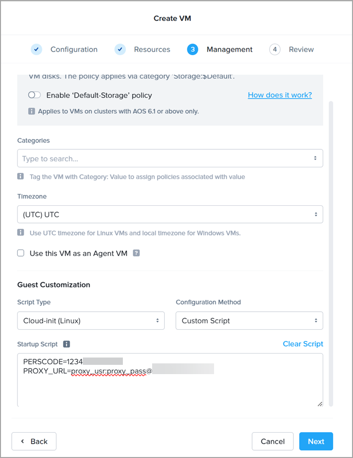 Nutanix supports a maximum size of 32 KB for VM guest customization script. This script can include personalization code, proxy settings, and static IP configuration for the VM's network interface. However, once the VM is deployed, the customization script cannot be modified. Instead, it's recommended to use the Scanner UI to configure these settings, as it allows changes at any time and provides greater flexibility. Also, please note that any changes made through the Scanner user interface will override the corresponding values defined in the original custom script.