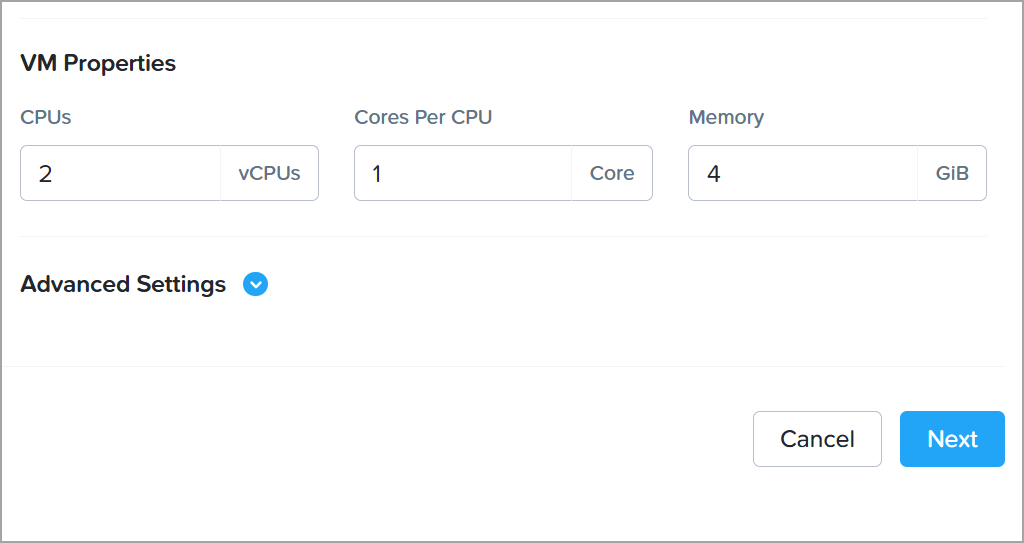 - In VM Properties, enter values for vCPU(S), Cores Per vCPU and Memory and click Next.