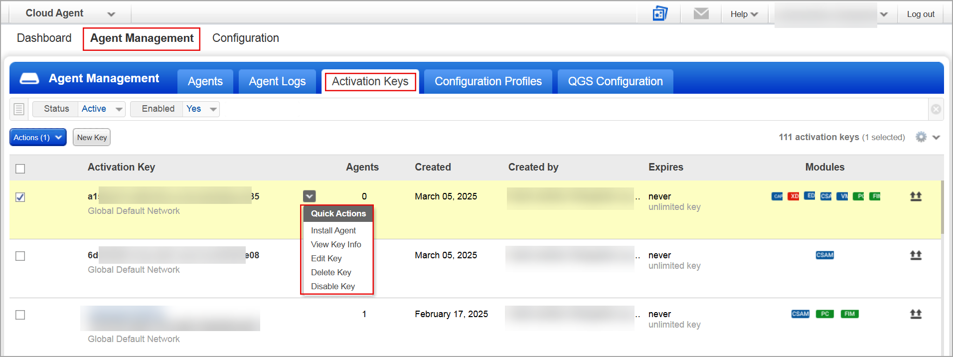 - Select an activation key and open the Quick Actions menu.