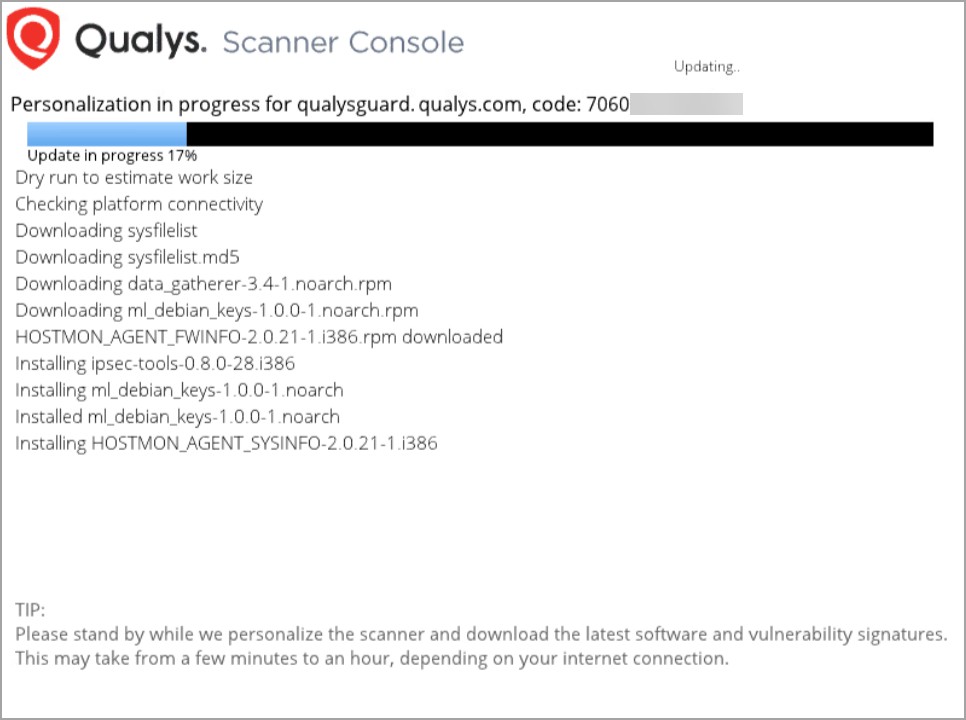 Once you enter the code, the activation process starts, and you can see the progress. This may take a few minutes to complete.Your virtual scanner must connect to our Cloud Security Platform to complete the activation and download the latest software versions.