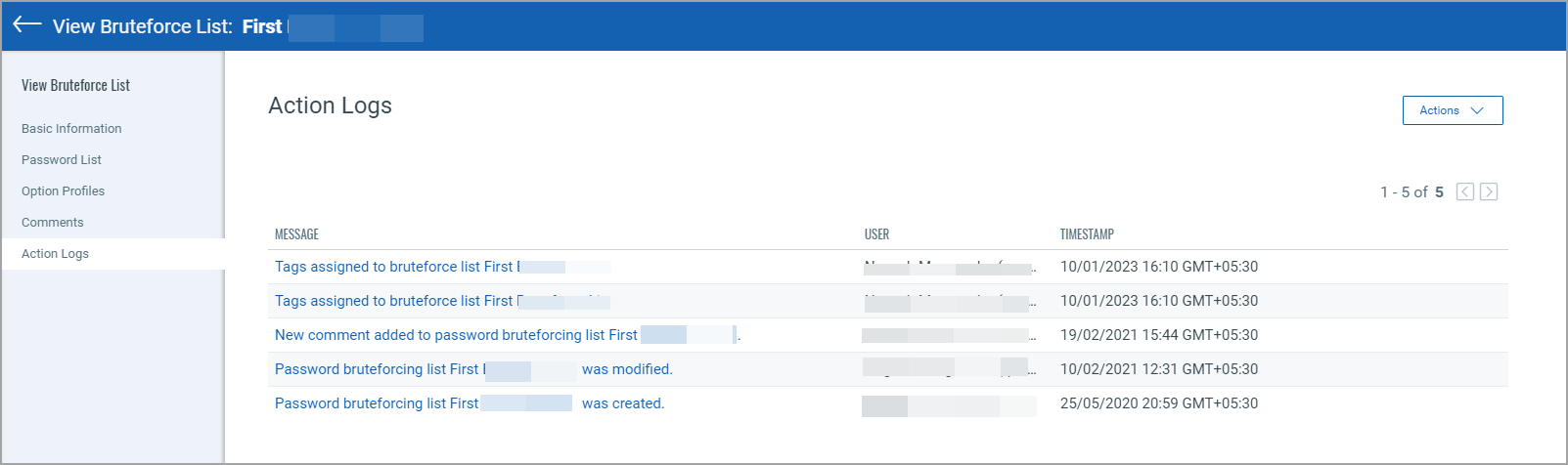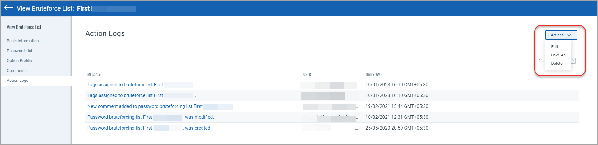 The Action Logs tab shows the actions performed on the bruteforce list by users. For example, tags and comments added or removed, and so on.