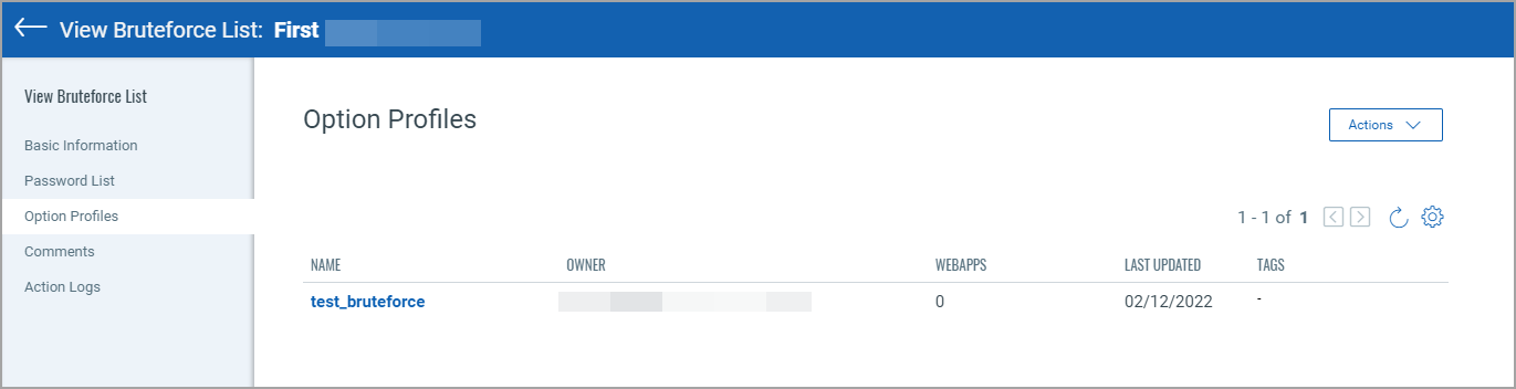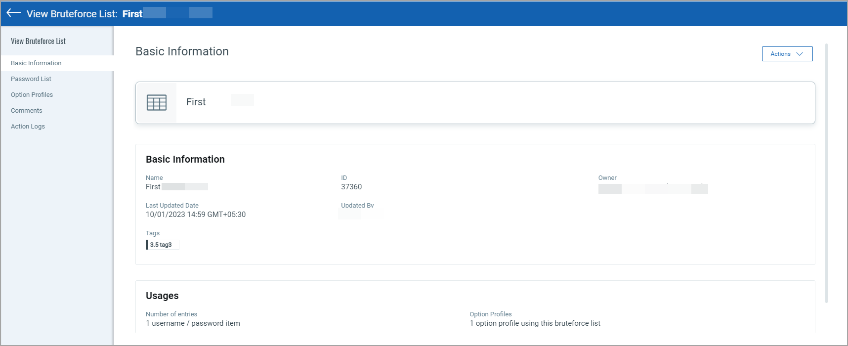 To view the details of a bruteforce list, select a bruteforce list, and from the Quick Actions menu, click View.