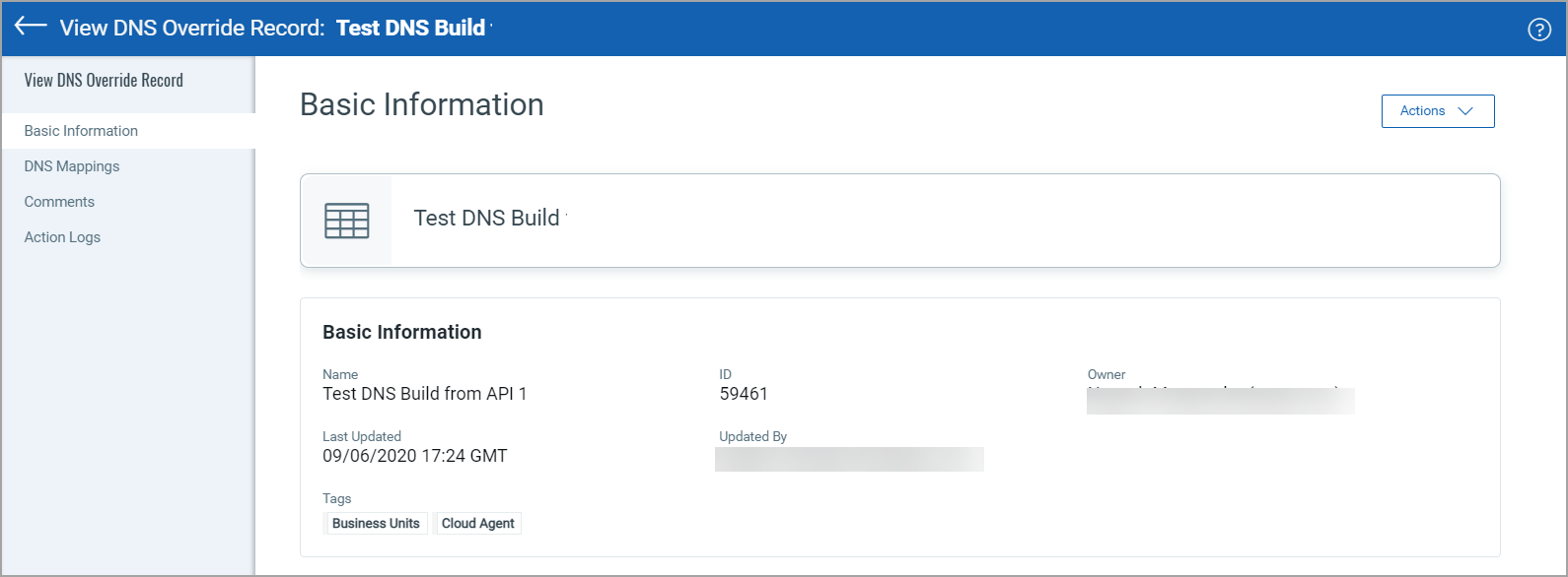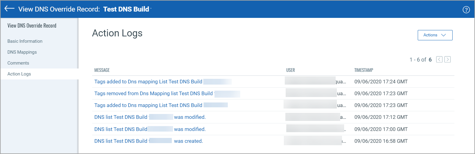The Action Logs tab shows the actions performed on the DNS override record by users. For example, tags and comments added or removed, and so on.