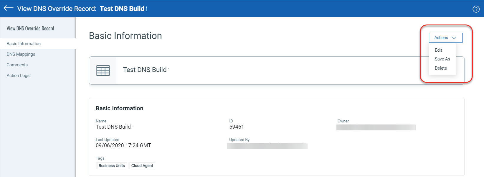 To view the details of a DNS override record, select a DNS override record, and from the Quick Actions menu, click View.
