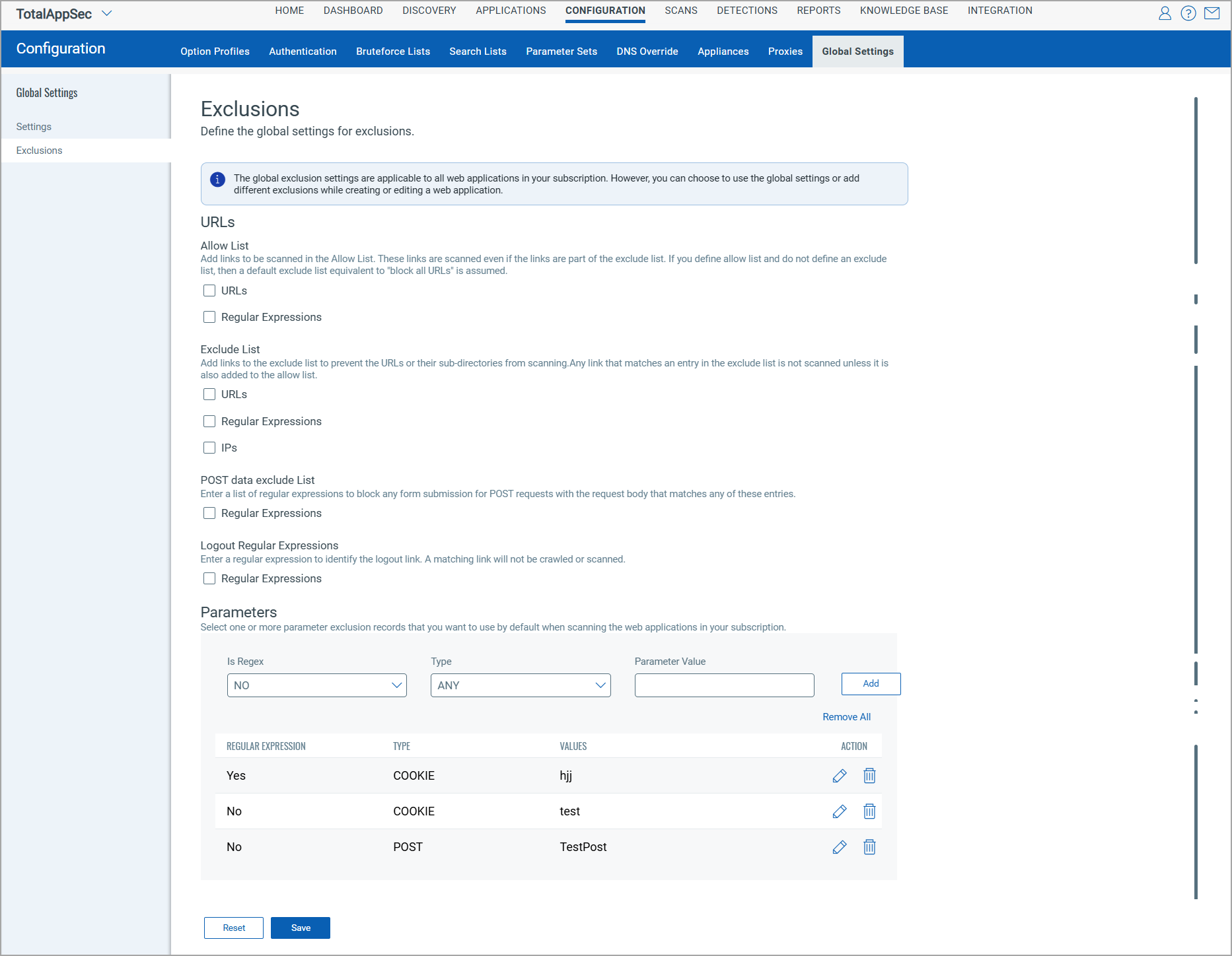On this page, you can set the exclusions to define which links to scan and which to ignore for all web applications in your subscription. You can define Allow List, Exclude List, Post data Exclude List and also regular logout expression where the matching link is not scanned.