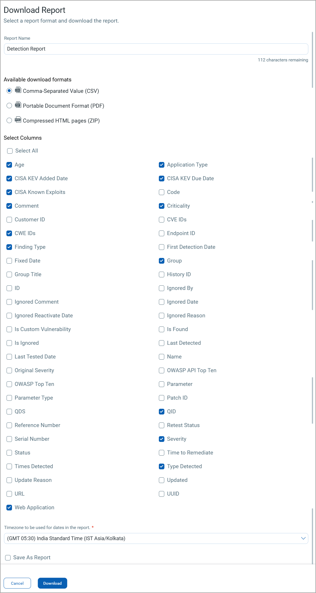 You can now select the columns that you want to include in the report while downloading the detection datalist report.