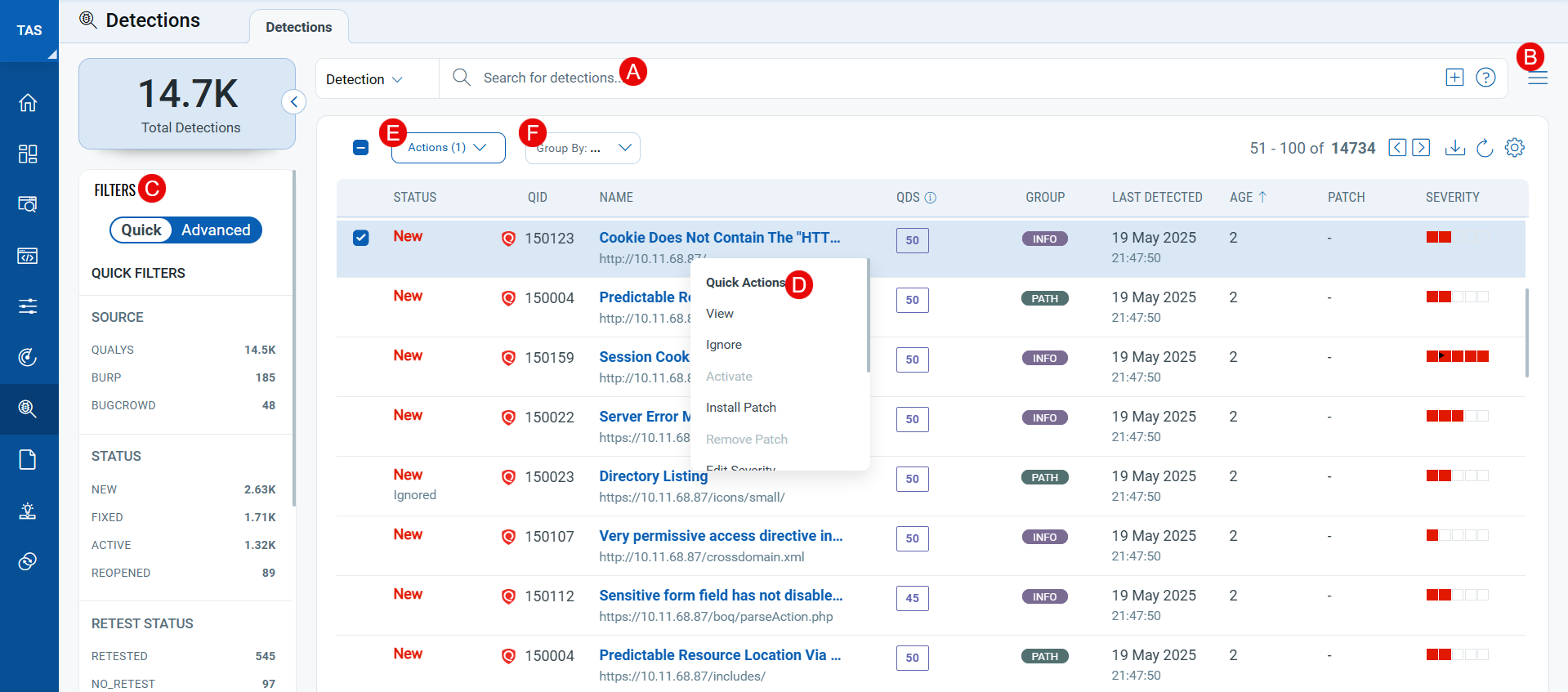 - From Quick filters, you can search detections by severity, source (Qualys, Bugcrowd, and Burp), status (Fixed, Active, New, Reopened), and confirmed and potential vulnerability.