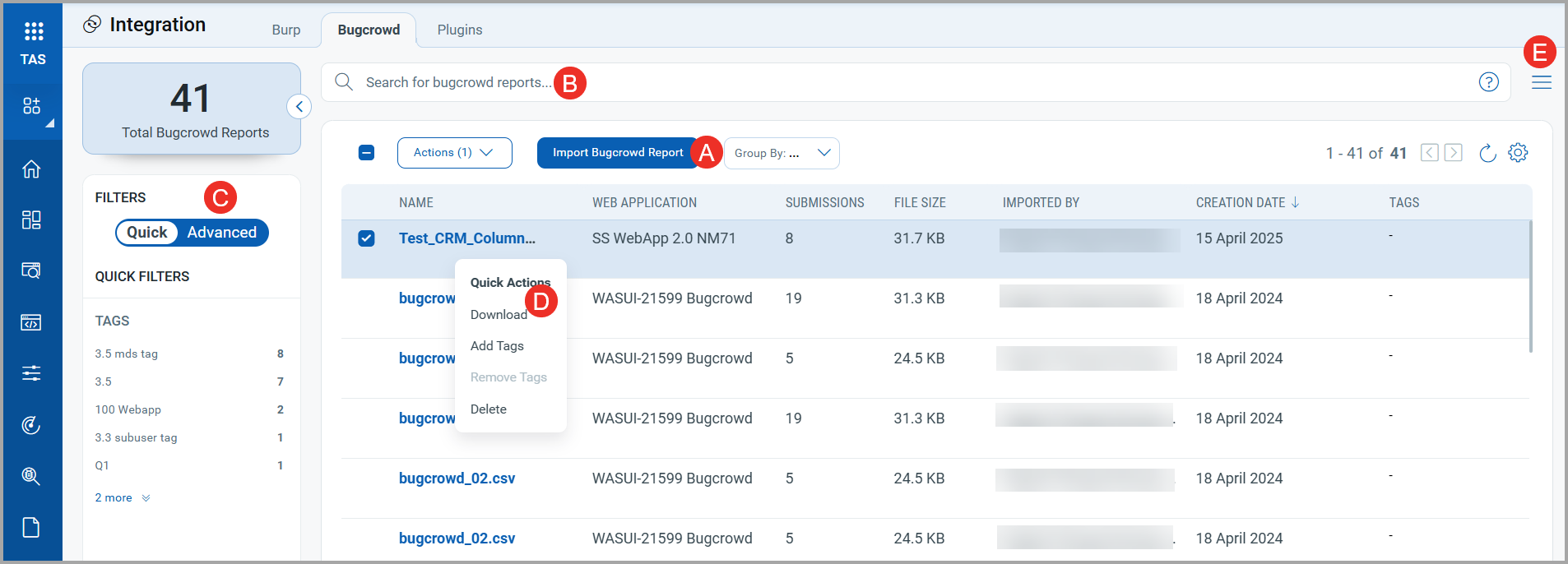 The Bugcrowd tab under Integration displays the bugcrowd reports that are imported. You can also import the Bugcrowd reports in this tab.