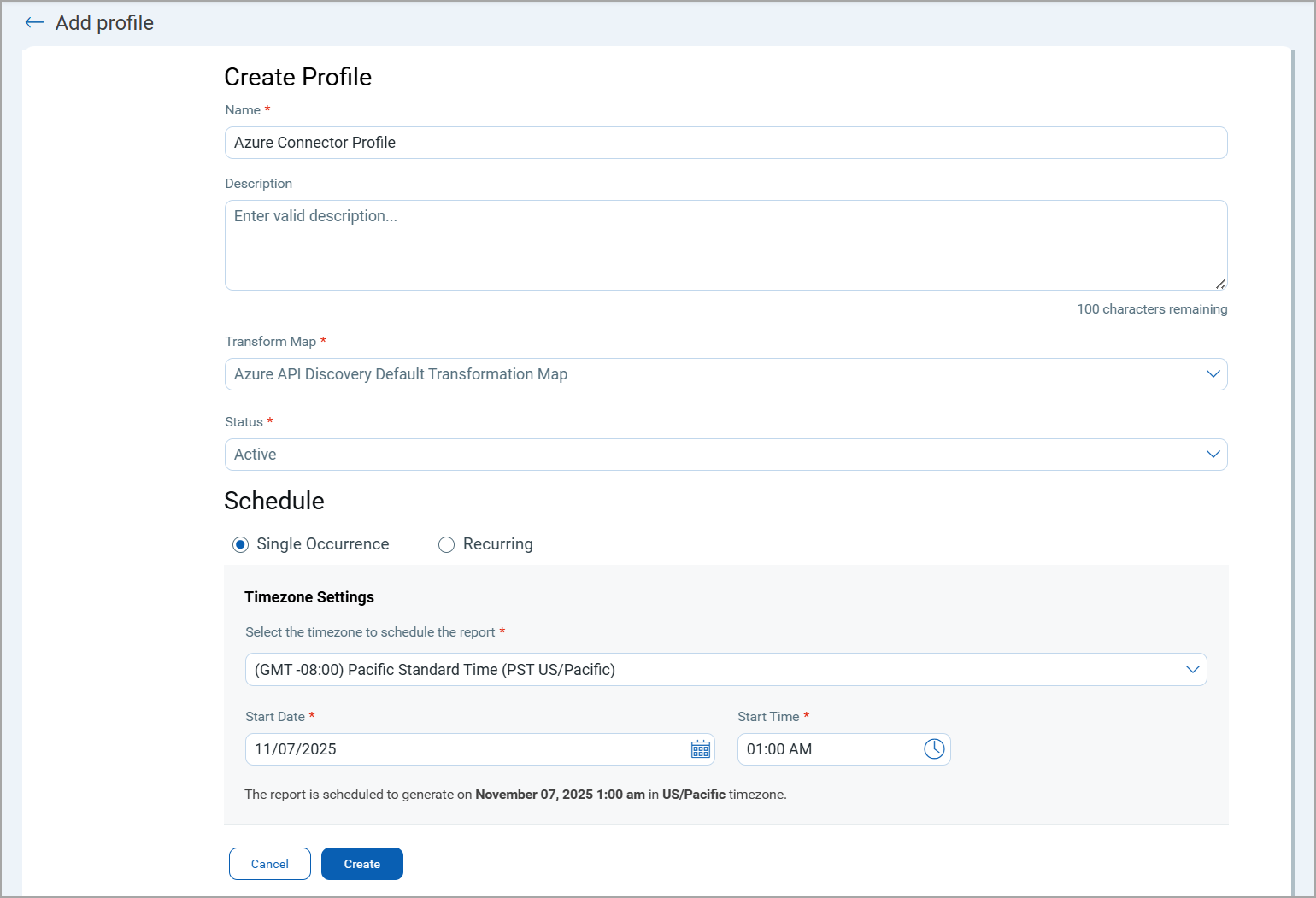 Create a profile for your connector. A profile decides the connector status, execution schedule, and transform map to choose. The connector follows the configurations of this profile for all future executions.