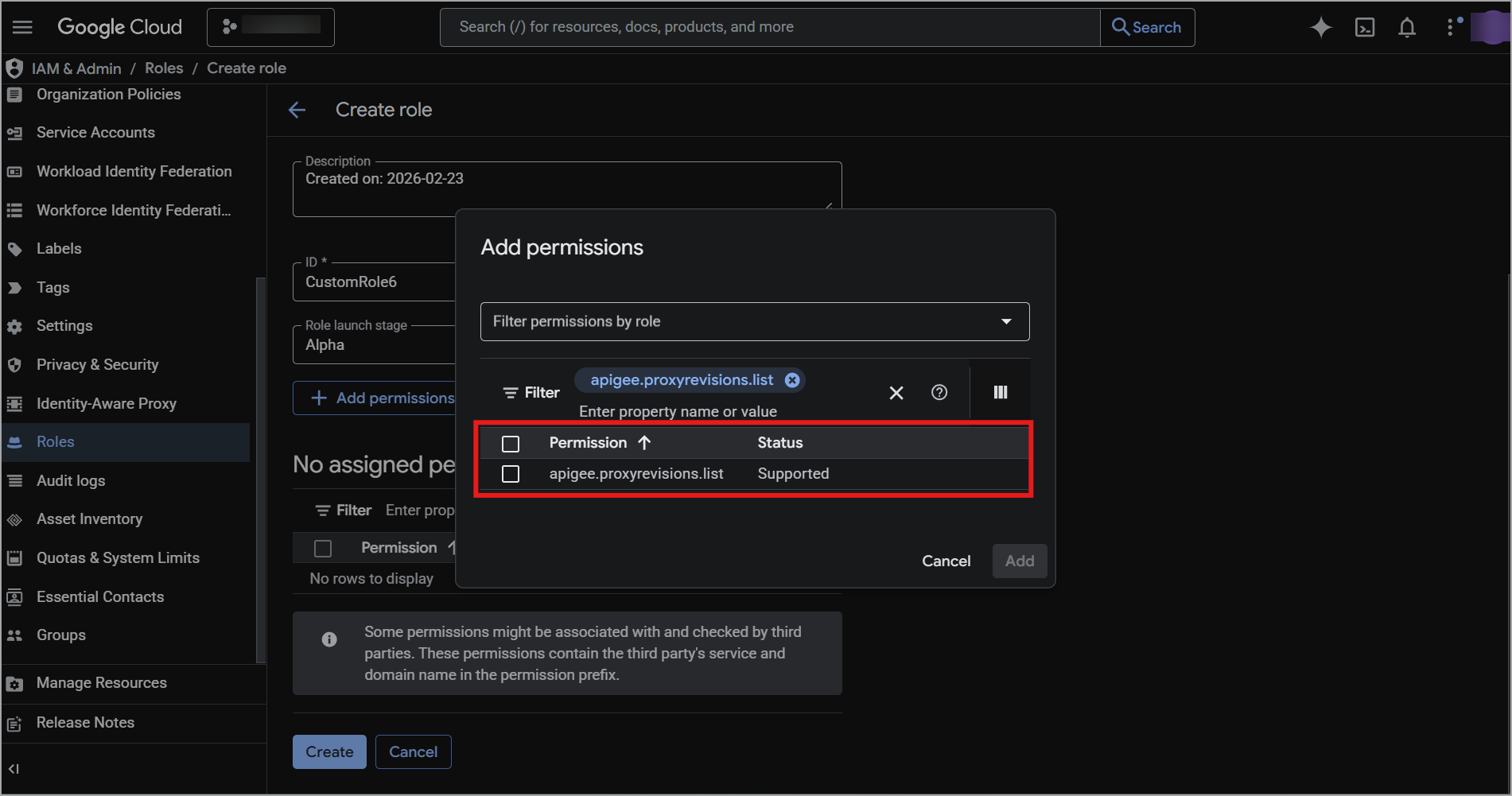 The following image displays the addition of apigee.proxyrevisions.list permission: