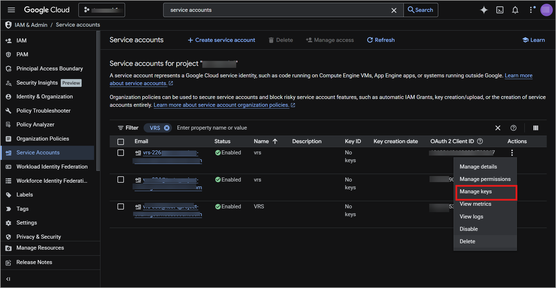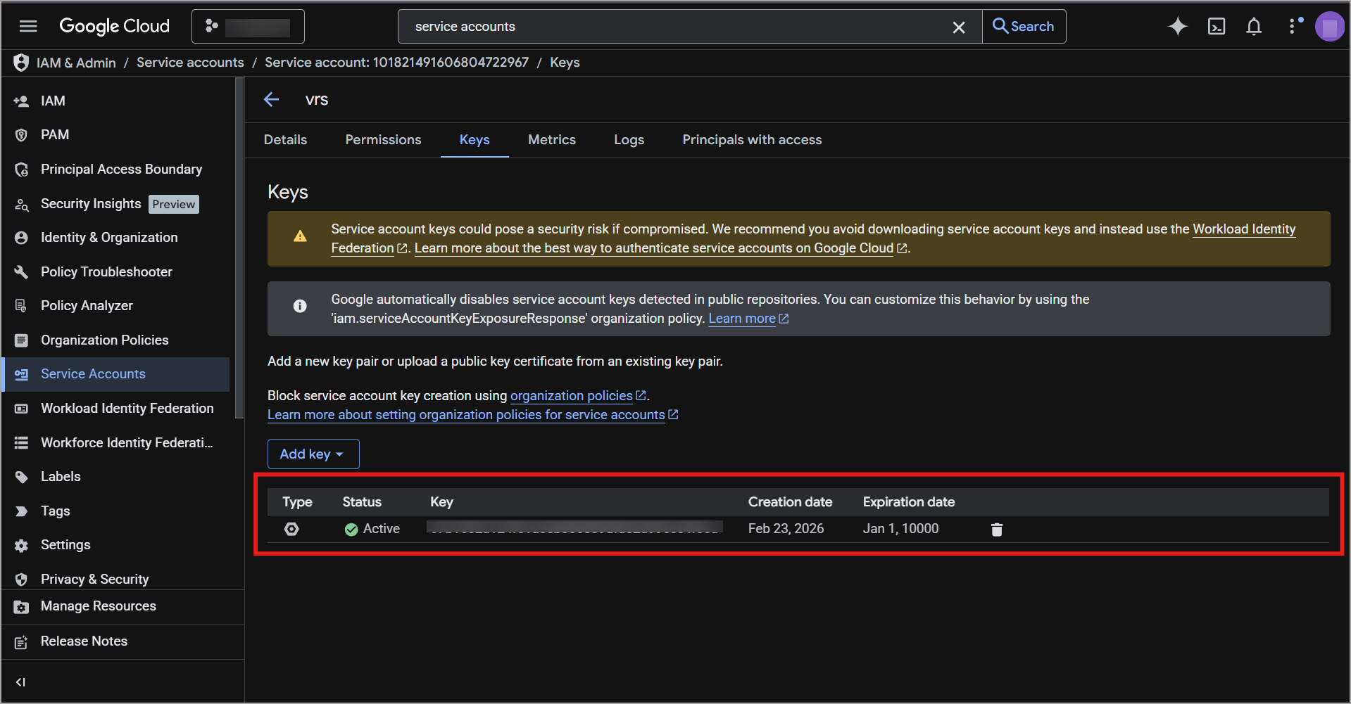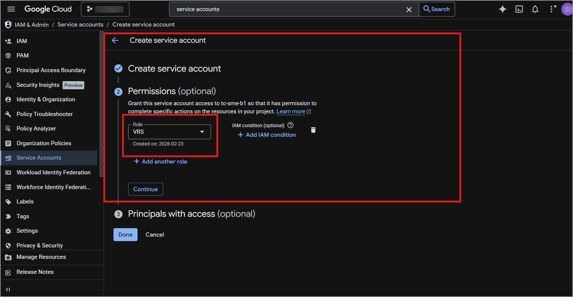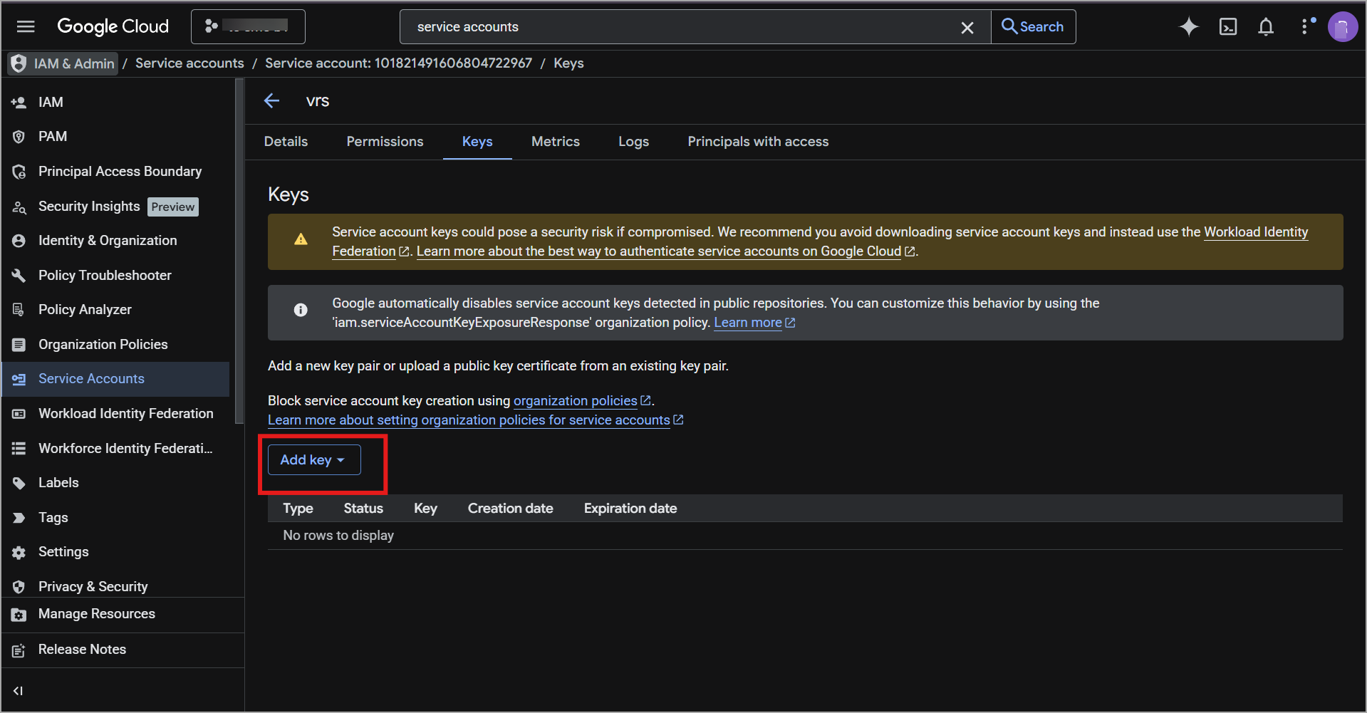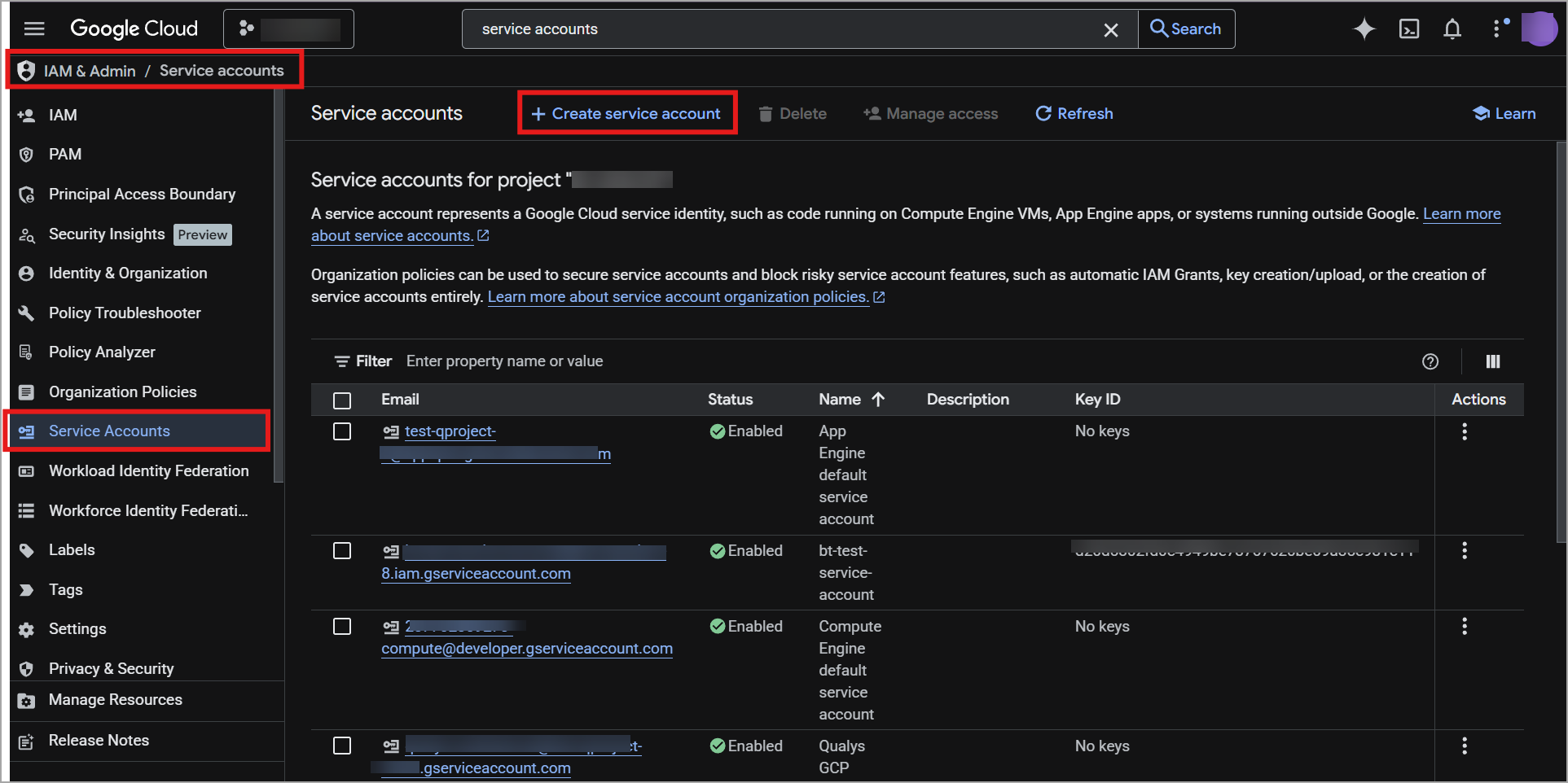 - Navigate to IAM &Admin / Service accounts > Service Accounts, and click Create service account.