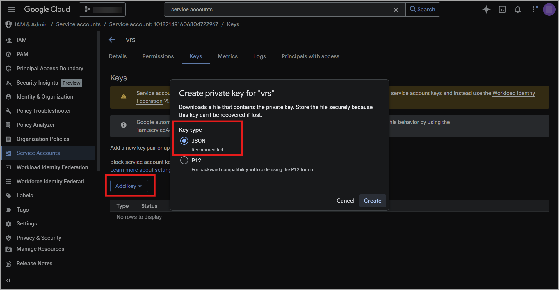 The JSON key file will be downloaded to your computer. Store this key file securely. Use the JSON file while creating the connector in the Basic Details step.