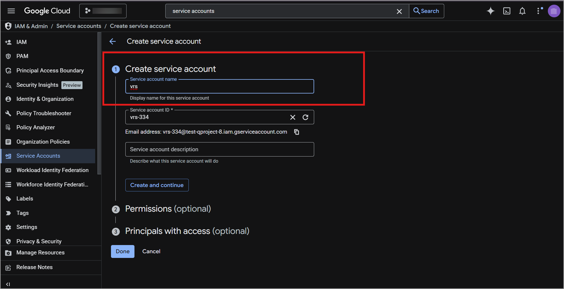 - In the Create service account, enter Service account name. The Service account ID is generated automatically based on this name.