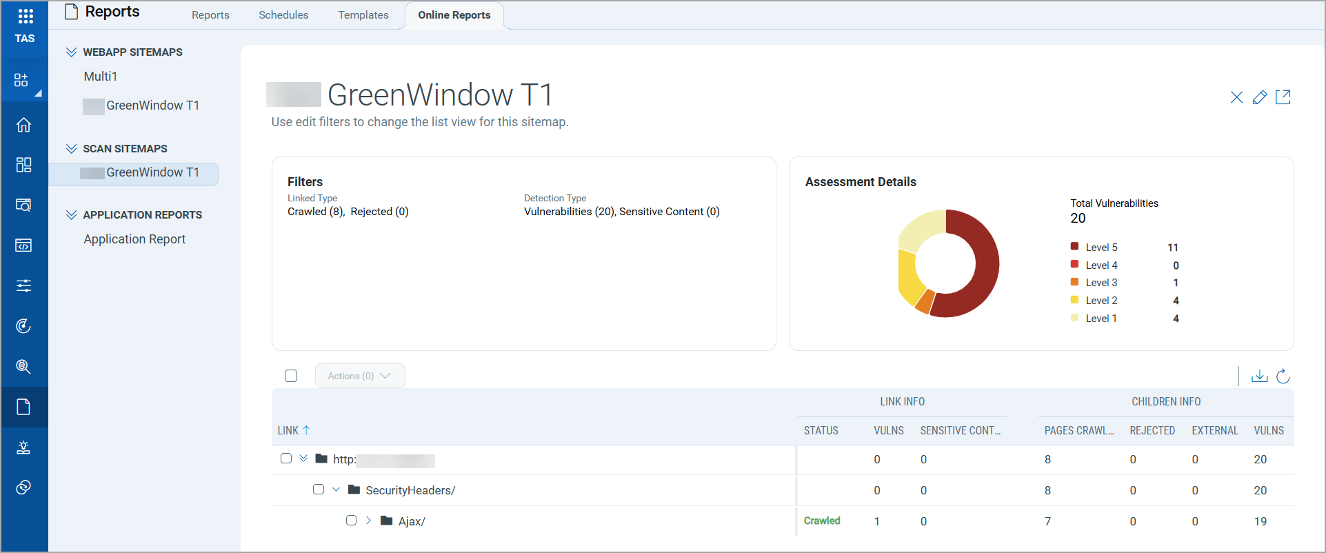To view the scan sitemap, in the Scan List tab, select a scan, and from the Quick Actions menu, click View Sitemap. You are directed to the Scan Sitemaps in the Online Reports tab under Reports.