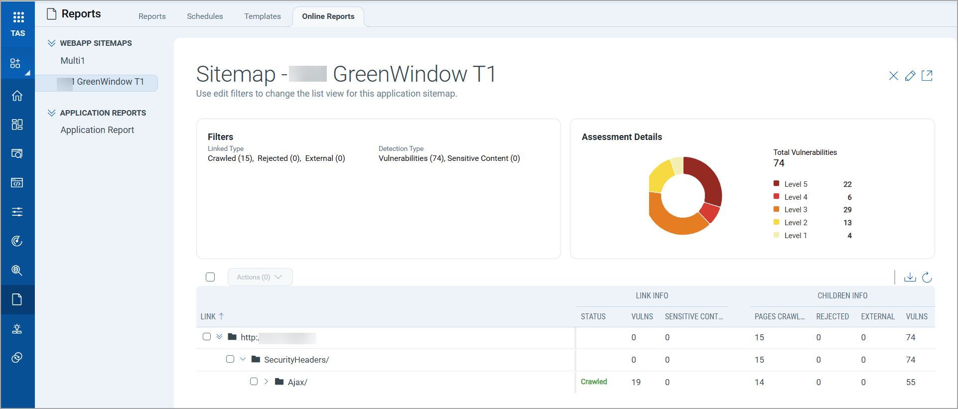 The Web Application Sitemap presents an interactive view of the security of a web application as a list of all pages/links scanned with views on the links crawled, vulnerabilities, and sensitive content detected.