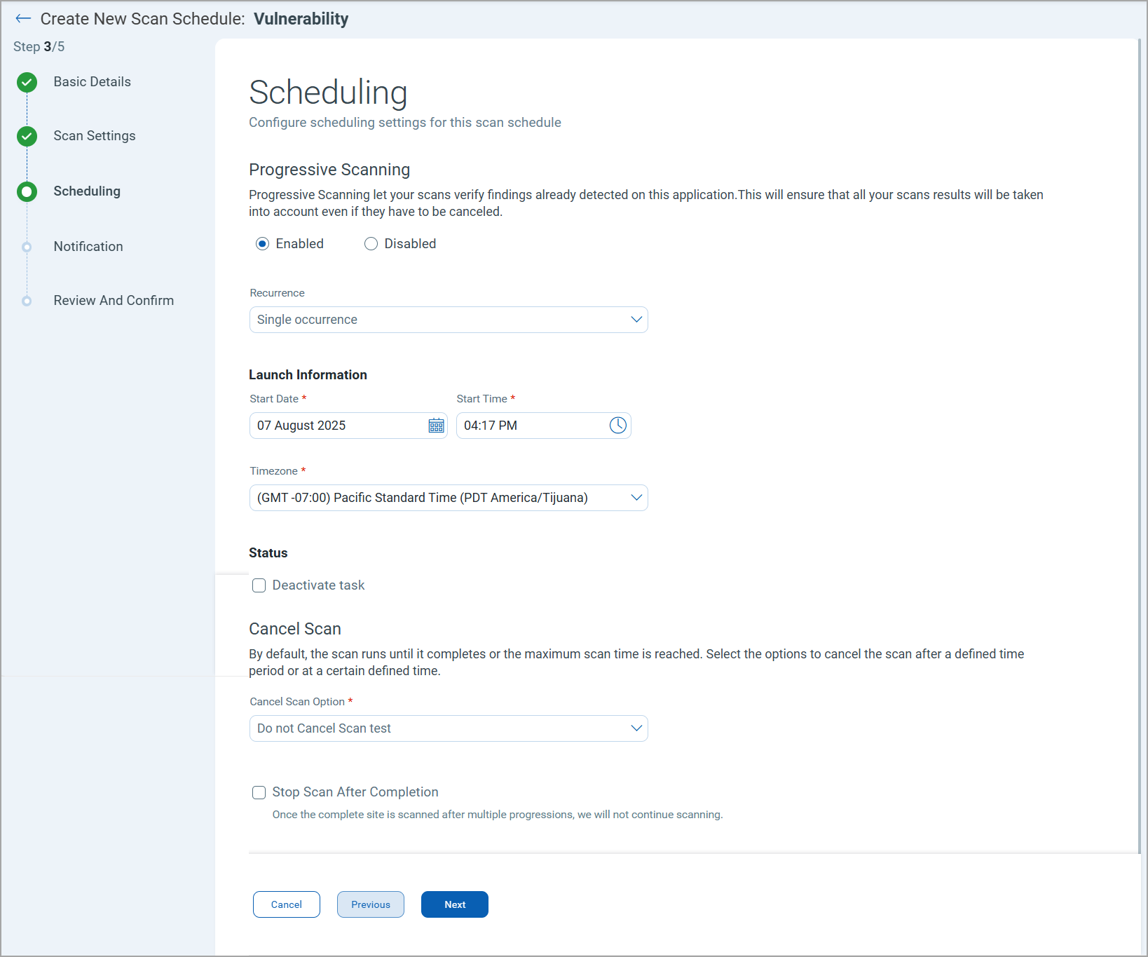 The Progressive Scan option is available only for the vulnerability scan schedules.