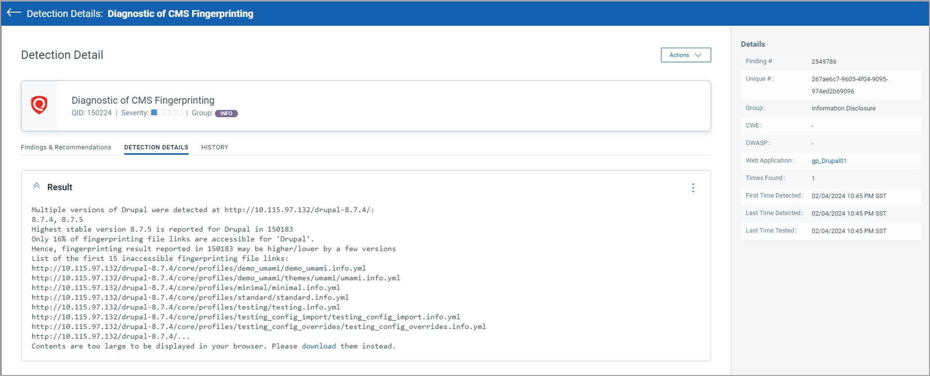| 150224 | Information Gathered | Diagnostic of CMS Fingerprinting | This QID is reported when CMS fingerprinting finds at least one of the following scenarios: - Several possible versions of CMS are identified, in which case all the detected versions are listed. - If plugin files are not accessible, then list of top 15 inaccessible links will be reported. - Too many fingerprinting file links are not accessible, in which case the percentage of accessible links is given and the first 15 inaccessible links (at most) are listed. |