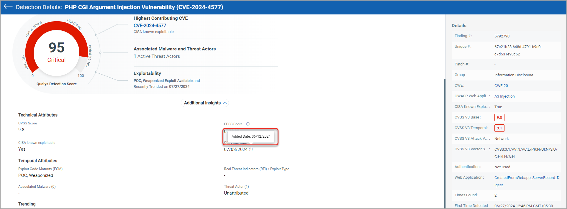 Use this token to search detections based on the date when CISA known exploitable vulnerability is added. The date is added in the YYYY-MM-DD format. |