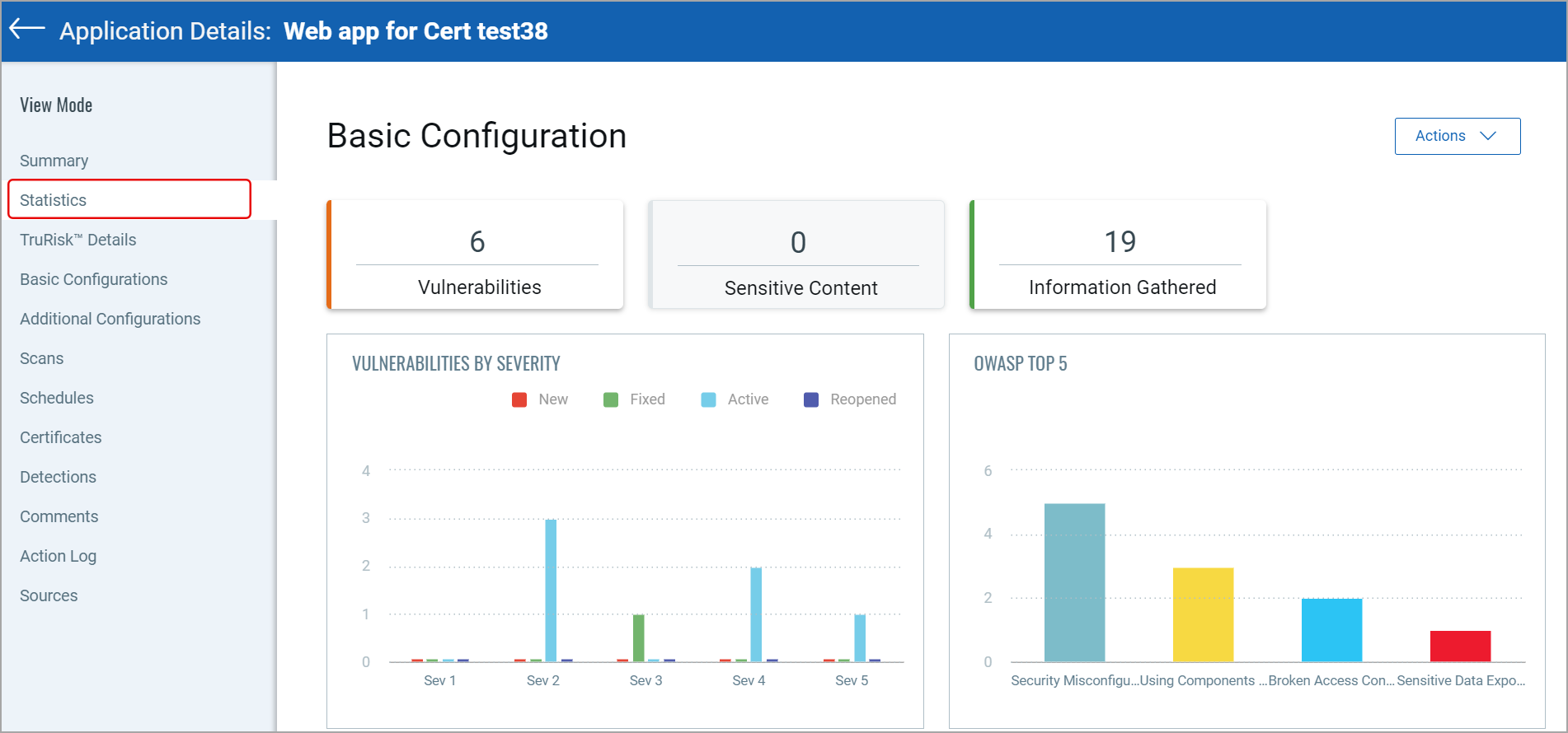 The Statistics tab shows the details such as active vulnerabilities and their categorization based on severity levels, count of sensitive content, the number of assets in the Information Gathered state, and the OWASP top five risks. Earlier, this information was displayed in the Summary tab.