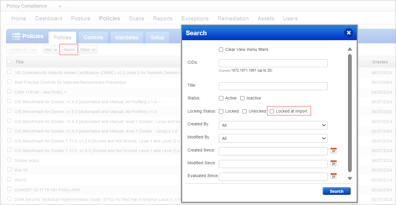 To view only the policies that are locked at import, on the Policies page, click Search > select the Locked at Import checkbox > Search.